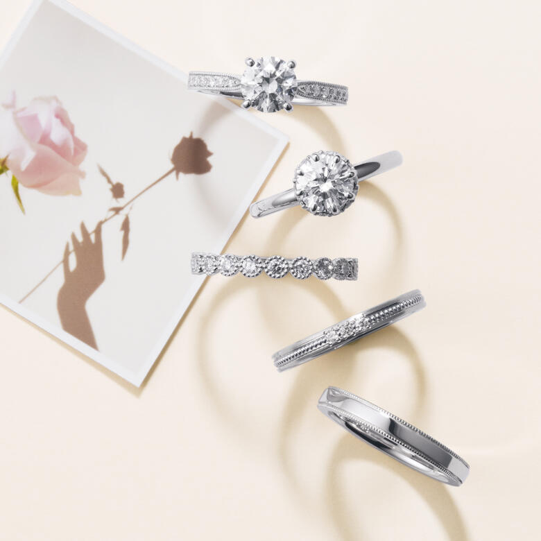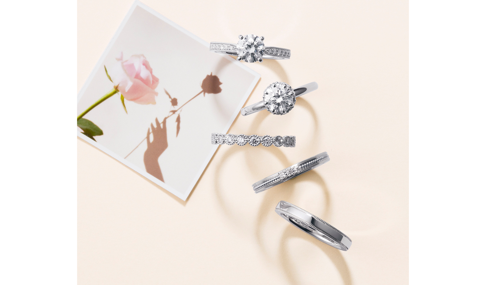 例えば、どの角度から見ても美しく見えるよう考え抜かれた、緻密なミル打ちの細工。リングの腕や石座に施されるミル打ちは、大きさや形がデザインによって異なります。ディテールまで作りこまれたリングは、永遠の愛の証にふさわしい高い完成度を誇ります。