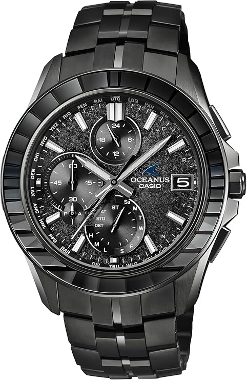月の光に照らされた夜の静かな海を、オールブラックのチタン外装と